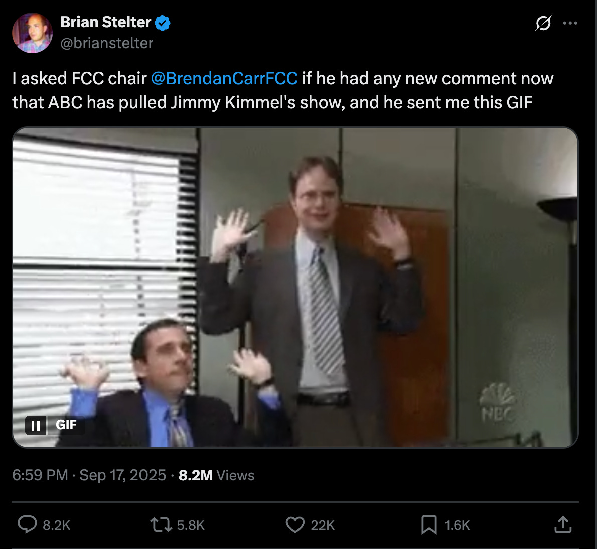 6:59 pm: CNN reporter Brian Stelter says when asked about ABC pulling Kimmel’s show, Carr sent him a celebratory GIF: