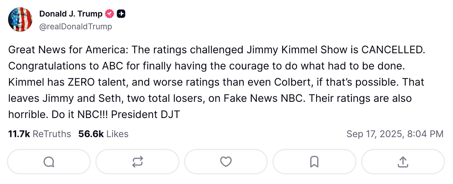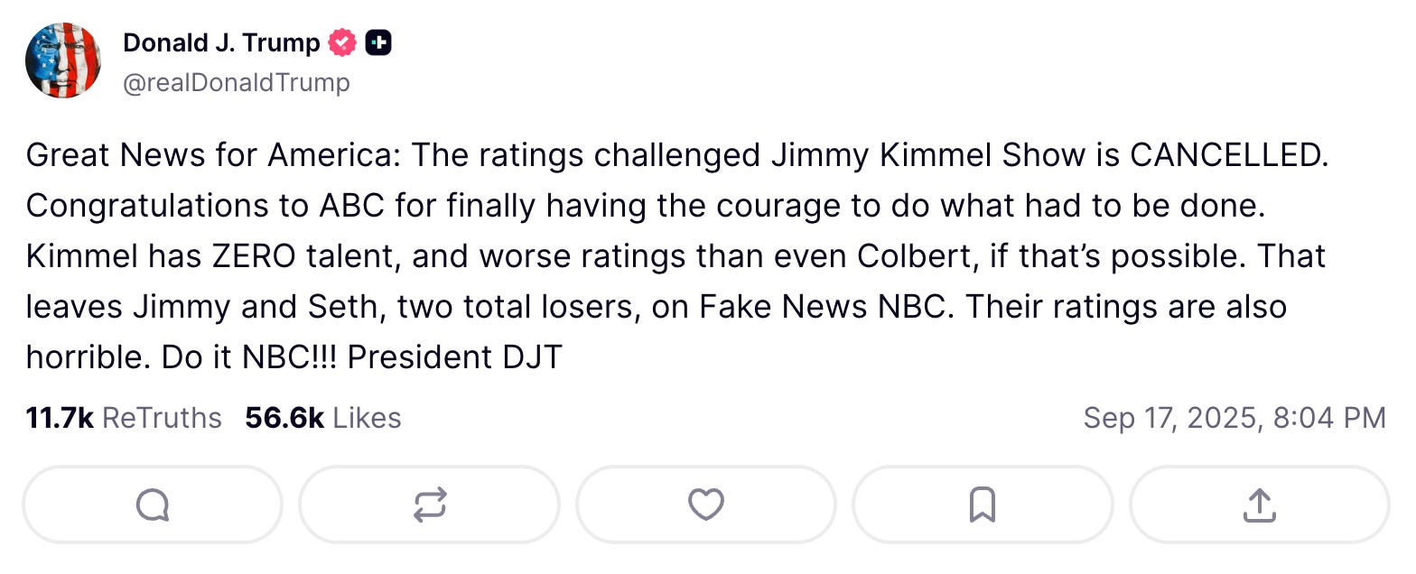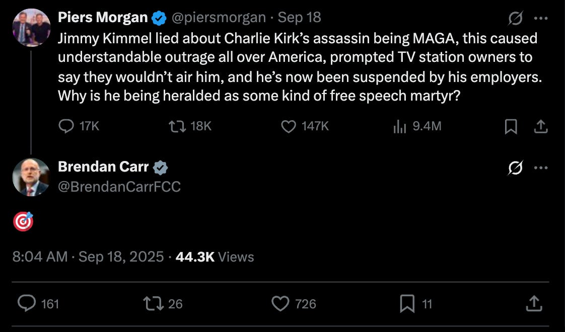 We also see Carr prompt affiliate station owners like Nexstar and Sinclair — seeking regulatory favor in pressing business before the government — to dial up the pressure on Disney in the lead up to Kimmel’s ouster. The specter of disfavorable treatment from the government poisons the chain from top to bottom. Finally, Trump and Carr celebrate after ABC suspends Kimmel indefinitely.