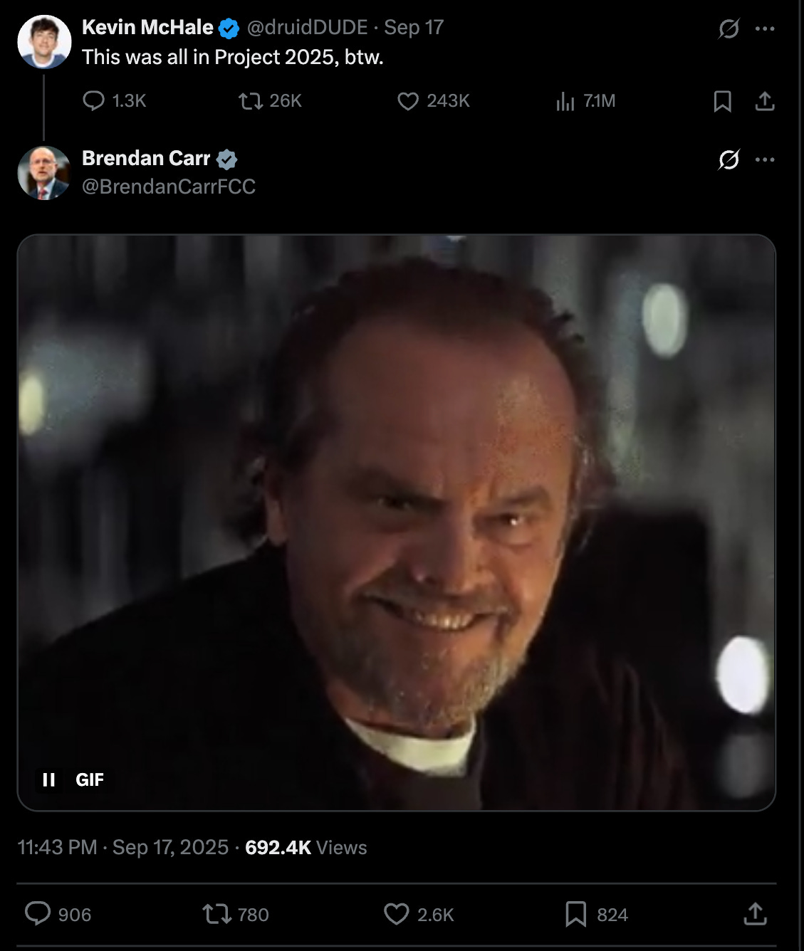 That’s exactly right, and if anyone knows what Brendan Carr is doing right now is unconstitutional jawboning — it’s Brendan Carr, as the record clearly shows.