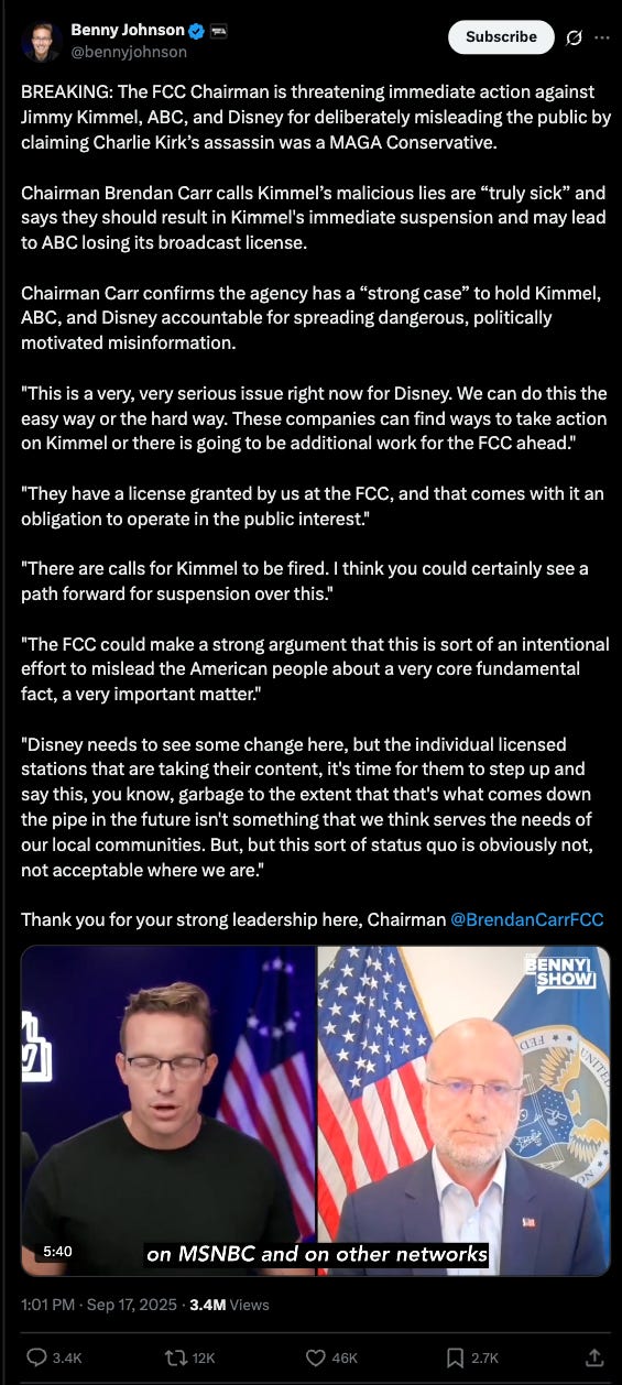 September 17: Carr appears on The Benny Johnson Show, with Johnson posting a summary at 1:01 pm, Carr addressing ABC parent Disney says: