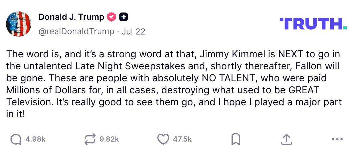 July 22: Days after CBS cancels the Late Show with Stephen Colbert, with the question of FCC approval for parent Paramount Global’s merger with Skydance looming large over it, Trump posts: