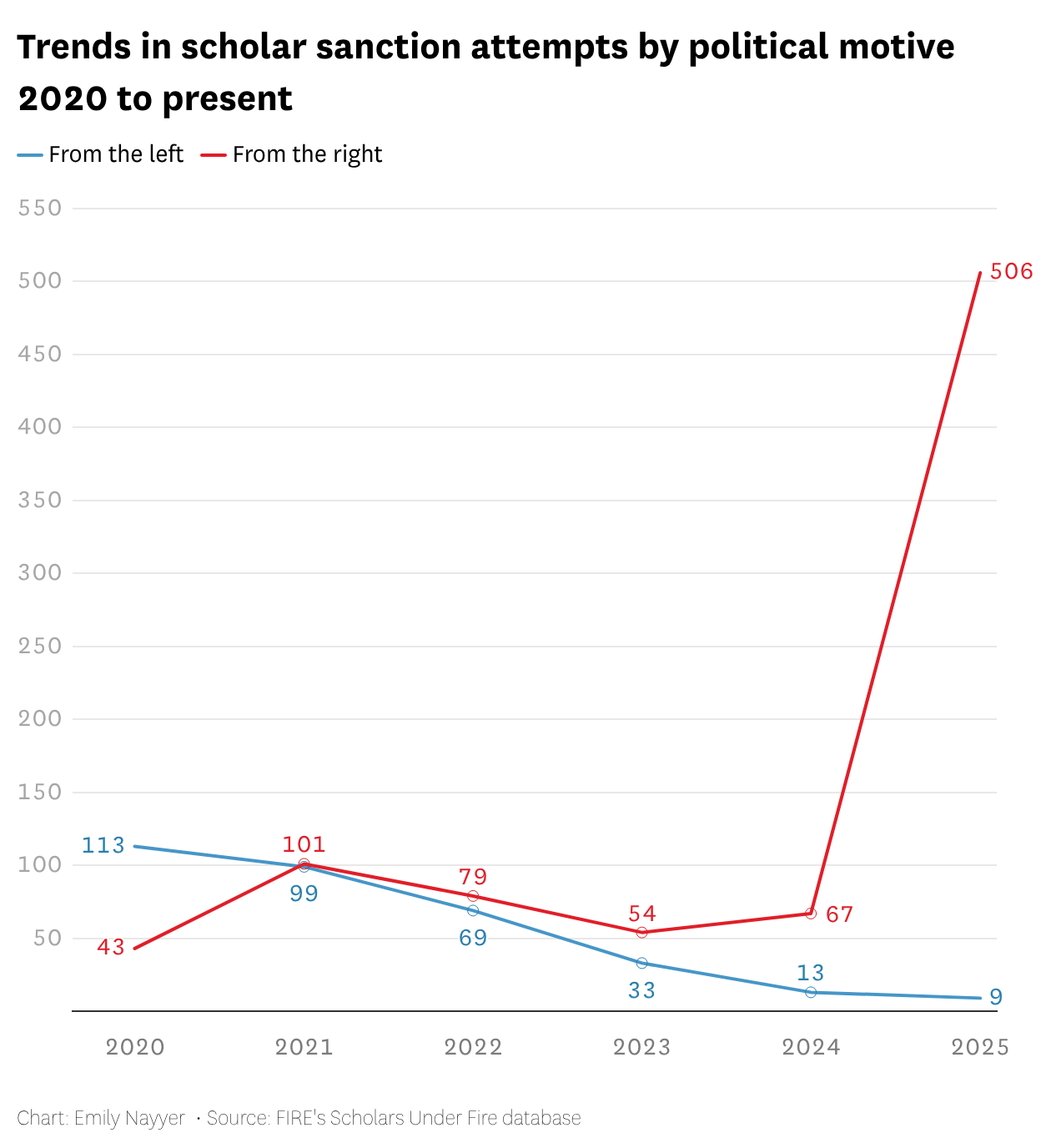 This accelerated a long-term trend — attempts to sanction scholars coming from the left of their expression have declined every year since 2020, while attempts from the right have exceeded those from the left every year since 2021.