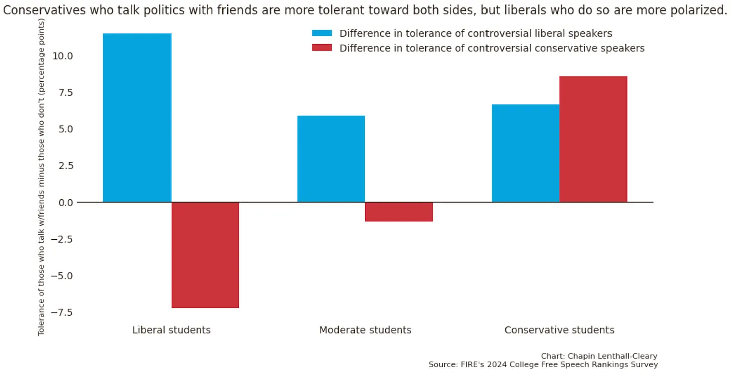 Conservatives who talk politics with friends are more tolerant of controversial speakers on both sides, while liberals who do so are more tolerant only of their own side, and less tolerant of the other.