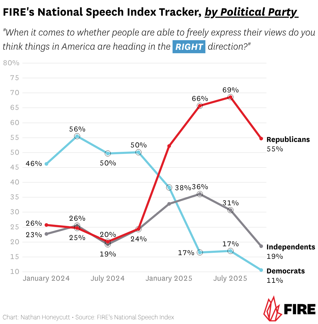 For the past two years, FIRE’s National Speech Index has tracked Americans’ views on free expression — whether the country is moving in the right or wrong direction, how secure people believe free speech to be, and how often they self-censor. Americans have generally said the country is headed in the wrong direction when it comes to free speech. But as Nate Honeycutt explains in this week’s data dive, those judgments are highly sensitive to political loyalties.