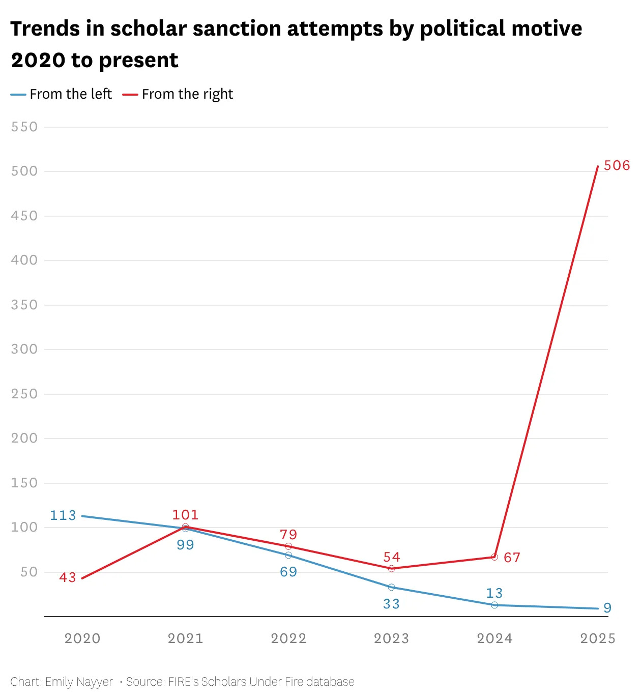 Last year, attempts to censor faculty speech on campus hit record levels, with more than one attempt per day. In total, FIRE’s Scholars Under Fire database recorded 525 sanction attempts, with 460 resulting in some form of punishment, including 29 firings. Even if we count multiple incidents at the U.S. Naval Academy as a single entry, 2025’s total still breaks records going back 25 years. Almost all these sanction attempts came from the right of the faculty member’s expression.