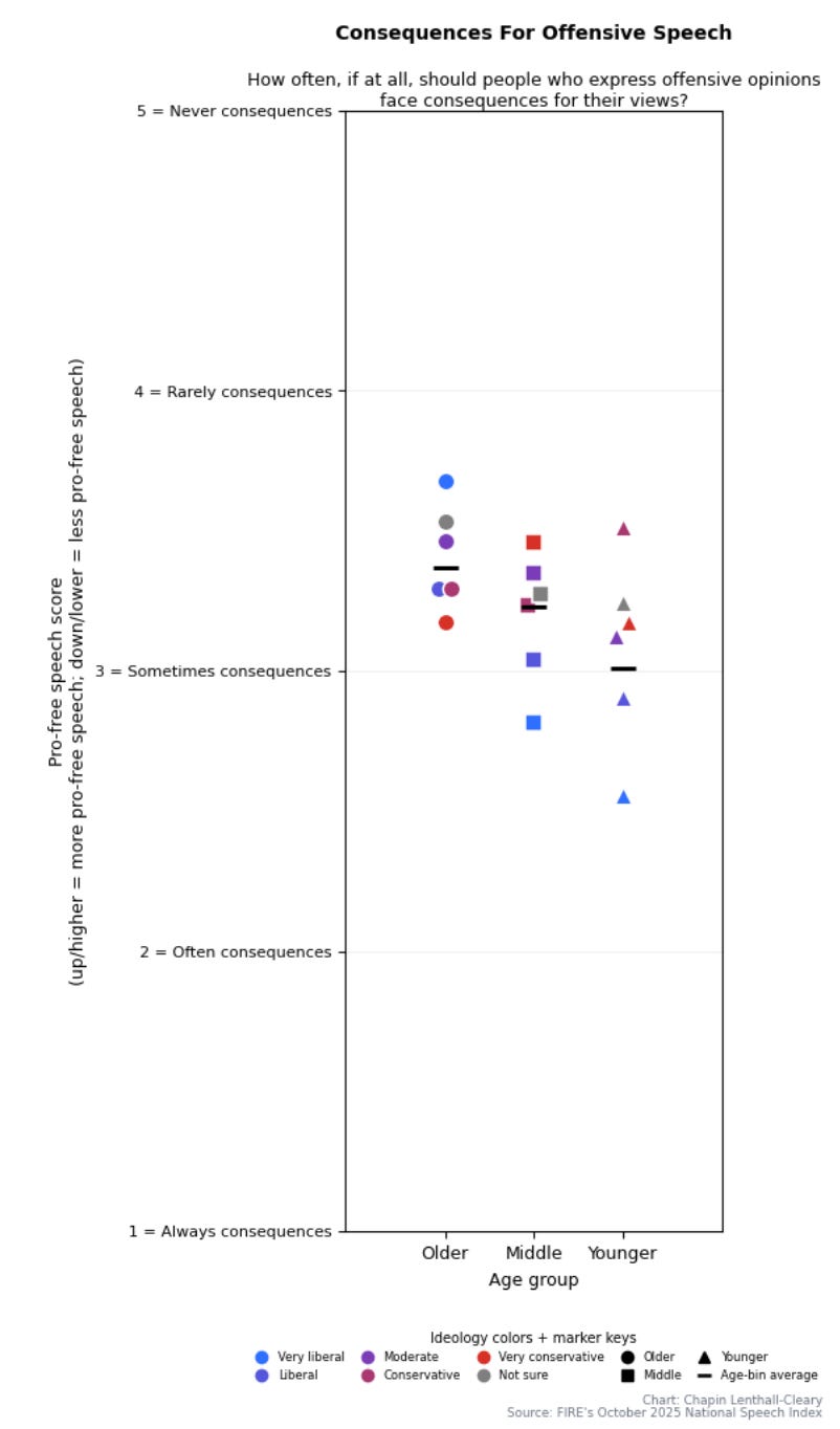 Regardless of ideology, Gen Z is vastly more likely to endorse violence against speakers than Boomers, with that effect being strongest among the “very conservative.” This is primarily a generational divide, and the impact of ideology is a distant second. But the intersection of age and ideology does produce some very interesting effects. When we ask, for instance, about whether offensive speakers should face consequences, we see the opposite effect for old and young liberals: