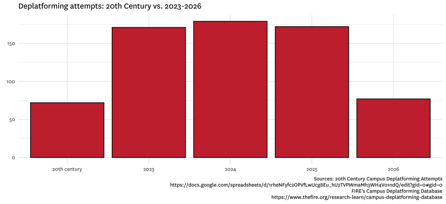 The post-World War II era saw widespread efforts to keep disfavored speakers off campus, often with remarkable success. But the modern era appears worse not simply because deplatforming still exists, but because it has become more frequent, more sustained, and in the most recent data, more successful. A 74% success rate in this 20th-century sample is troubling enough. But early 2026 data reveals a 93% success rate. The lesson is not merely that campus deplatforming has a long history, but that we are far from done with this fight. Indeed, by one crucial measure, this is our darkest hour.