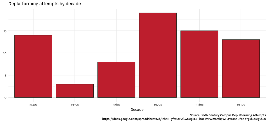 An analysis of 72 campus deplatforming attempts — efforts to stop public expression on college campuses — from 1947 to 1999 shows that these efforts have their roots in the immediate post-World War II period.