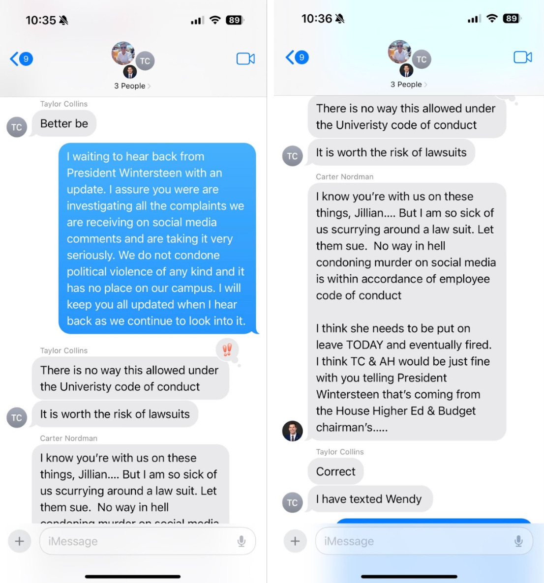 That outrage did not stay confined to the internet. Behind the scenes, Iowa lawmakers urged university officials to take action. The records obtained by FIRE show text messages from state lawmakers to Board of Regents State Relations Officer Jillian Carlson. State Rep. Carter Nordman sent Carlson a screenshot of Spencer’s post, asking, “Will she be put on leave today?” Rep. Taylor Collins added that Spencer “better be” put on leave.