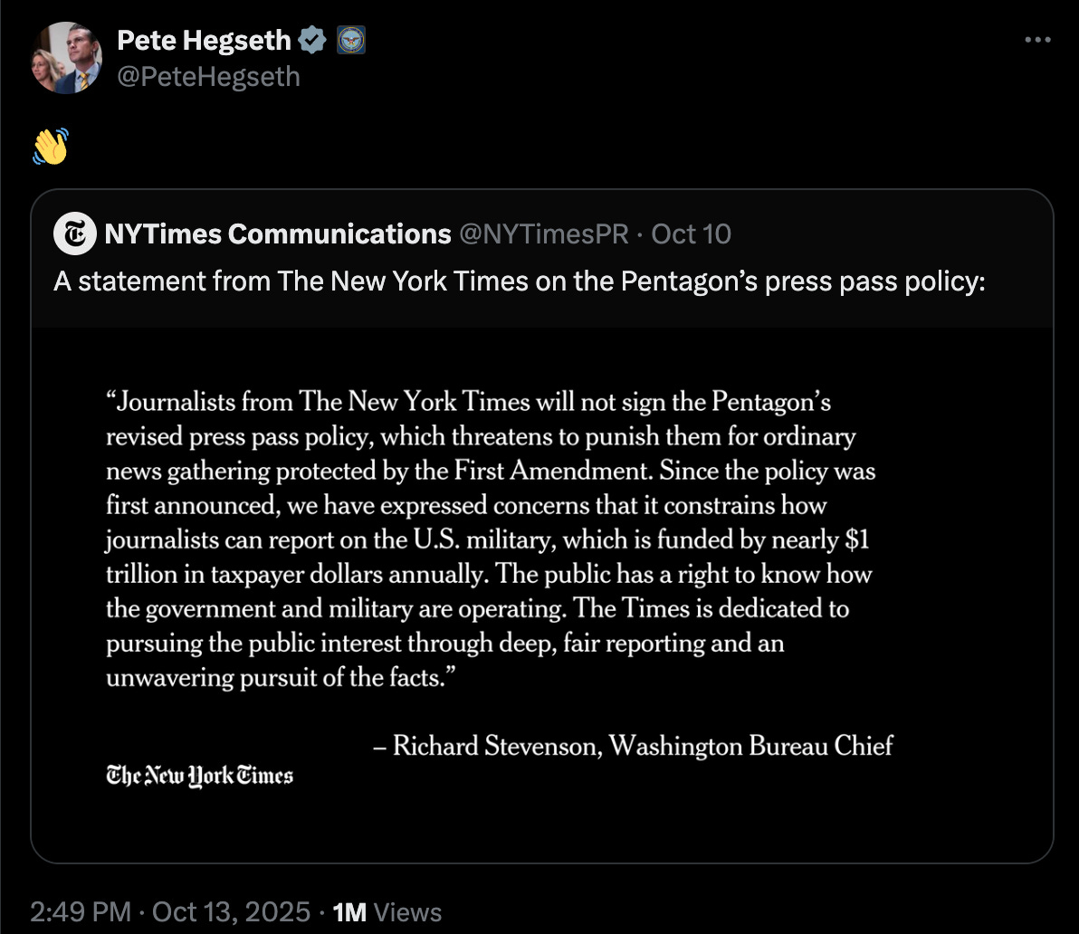 (H/t to the Reporter’s Committee for Freedom of the Press, both for writing to the Department of War about the policy and actually sharing the policy with the world, which, in the most recent version, was rare indeed.)