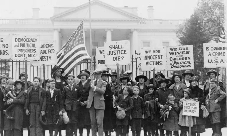 ![Drawing shows Uncle Sam rounding-up men labeled "Spy," "Traitor," "IWW," "Germ[an] money," and "Sinn Fein" with the United States Capitol in the background displaying a flag that states "Sedition law passed" referring to the Sedition Act of 1918. Drawing shows Uncle Sam rounding-up men labeled "Spy," "Traitor," "IWW," "Germ[an] money," and "Sinn Fein" with the United States Capitol in the background displaying a flag that states "Sedition law passed" referring to the Sedition Act of 1918.](https://substackcdn.com/image/fetch/$s_!9Vge!,w_1456,c_limit,f_auto,q_auto:good,fl_progressive:steep/https%3A%2F%2Fsubstack-post-media.s3.amazonaws.com%2Fpublic%2Fimages%2Fffc25196-1ad8-4c68-bf8a-537c50a0e0c2_417x534.webp)