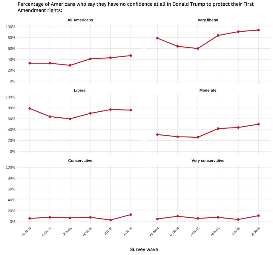 In January 2025, shortly after Trump returned to office, 29% of Americans said they had “no confidence at all” that he would defend their expressive rights. One year later, 47% say the same, an increase of almost 20 percentage points in just a year. In April, a whopping 84% of very liberal Americans said they had no confidence in Trump to defend their expressive rights. Now 94% of them say this. The percentage of very conservative respondents who agree rose from 4% in July 2025 to 11% now, and among conservatives, from 3% in July to 13% now.