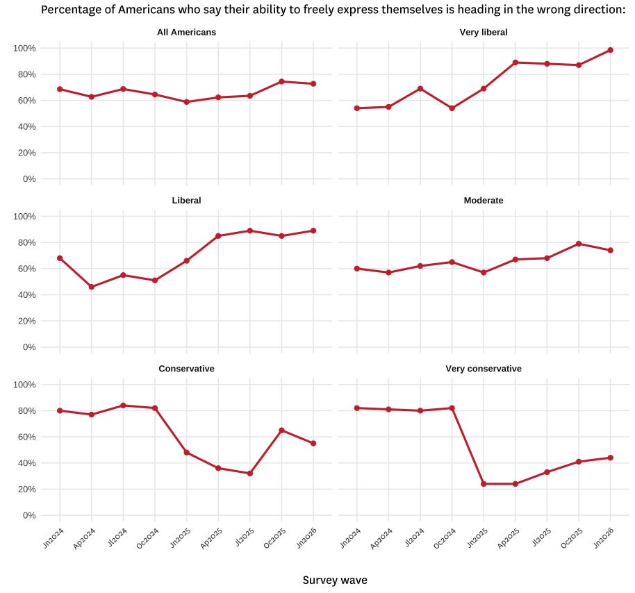 This is what you’d expect if “wrong direction” is partly a referendum on who’s running the executive branch. But the story can’t be reduced to just that. The liberal side’s volatility over the past few years indicates something beyond simple party-in-power logic and suggests that recent events have driven their perception of the country’s expressive environment. So while the color of the president’s necktie sets a baseline, it doesn’t lock perceptions in place. Events and institutions beyond the presidency also plausibly shape how safe people feel speaking freely.