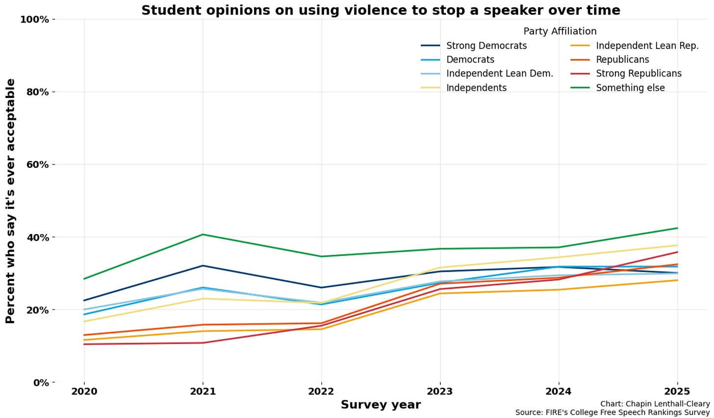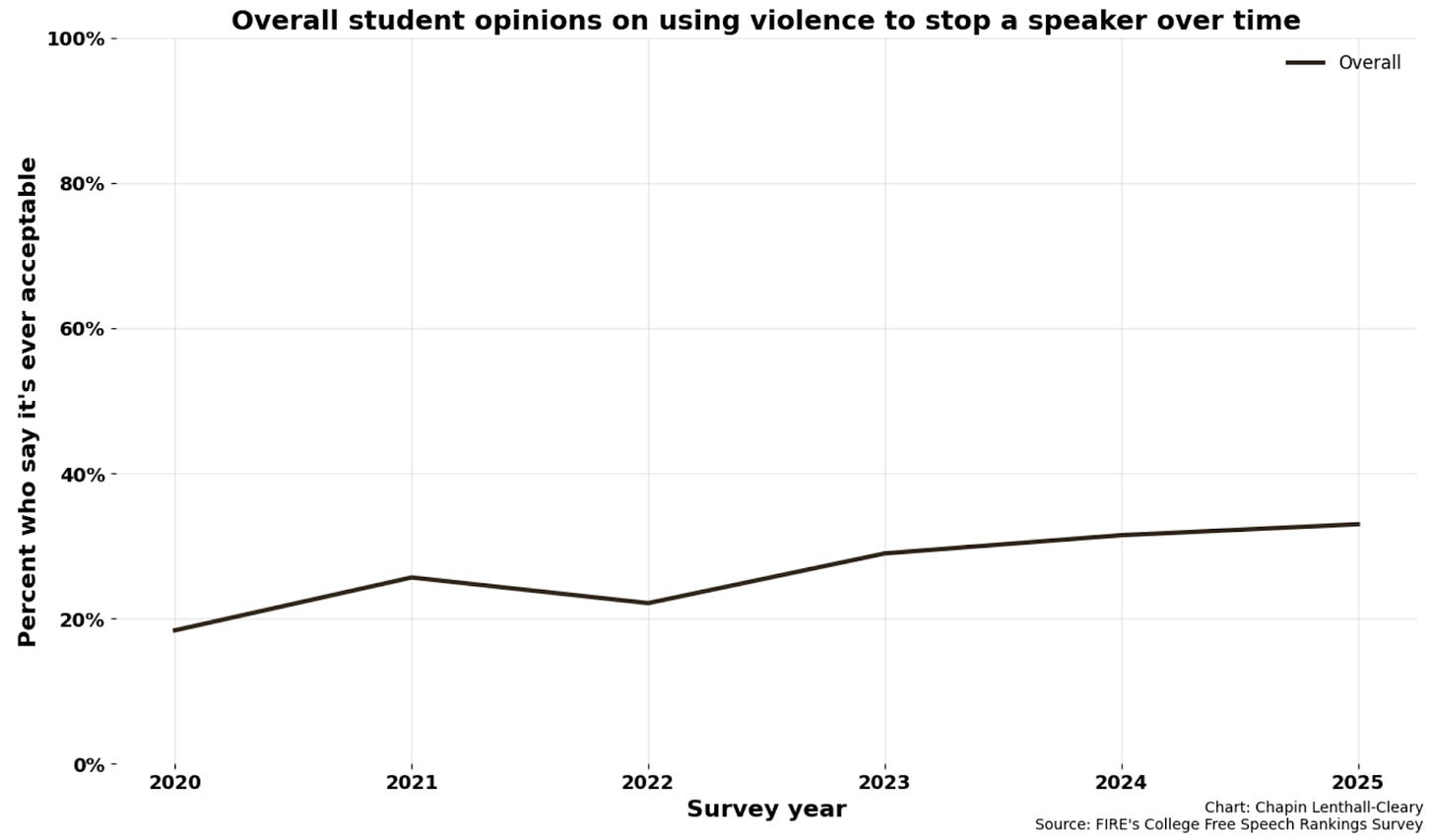 According to FIRE’s annual College Free Speech Rankings survey, in 2020, the national average showed about 1 in 5 students said it was ever acceptable to use violence to stop a speaker. That number has since risen to a disturbing 1 in 3 students.