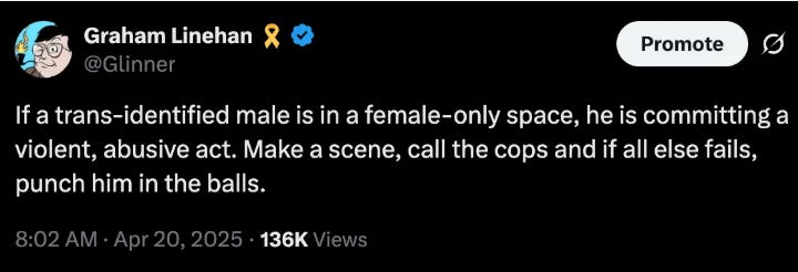 And Irish comedian Graham Linehan was arrested by five armed police officers at Heathrow Airport last week. Linehan, a vocal critic of gender self-identification, rejects the idea that biological sex can be changed and opposes access for biological males to female-only spaces. His alleged crime apparently consisted of three tweets from April, one of which read: