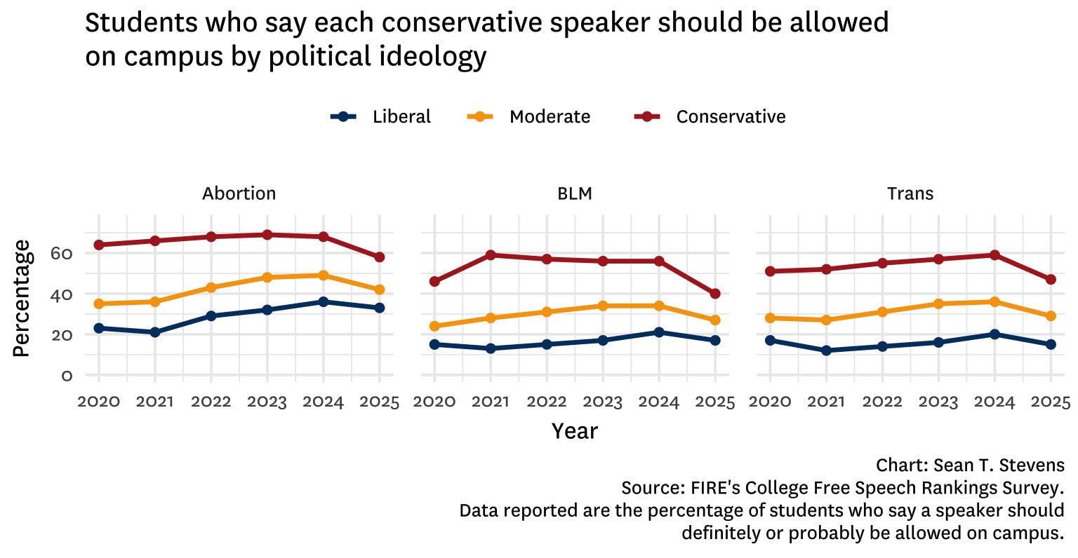 This year, for the first time ever, at least half the students surveyed oppose allowing any of the above controversial speakers — primarily due to a drop in tolerance among conservative students for the three conservative speakers.