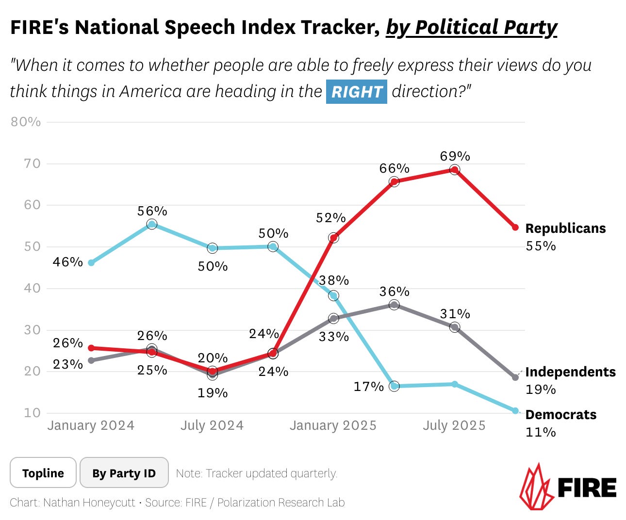 “In the last three months, America watched as Charlie Kirk was murdered for simply debating on a college campus, followed immediately by a wave of censorship of those who opposed his views,” said FIRE Research Fellow & Polling Manager Nathan Honeycutt. “It’s no surprise that a record number of Americans of all parties now think that it’s a dire time for free speech in America.”
