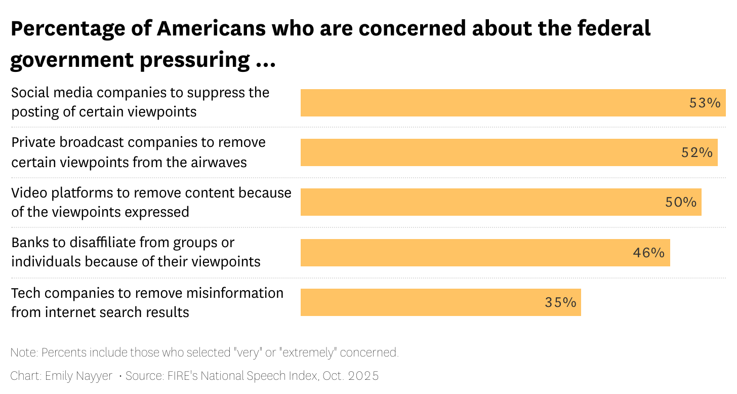 “Americans are deeply concerned about jawboning — and they’re right to be,” said FIRE Legislative Director Carolyn Iodice. “Both parties have been guilty in recent years of using government pressure to silence speech. This isn’t a partisan issue; it’s a constitutional one.”