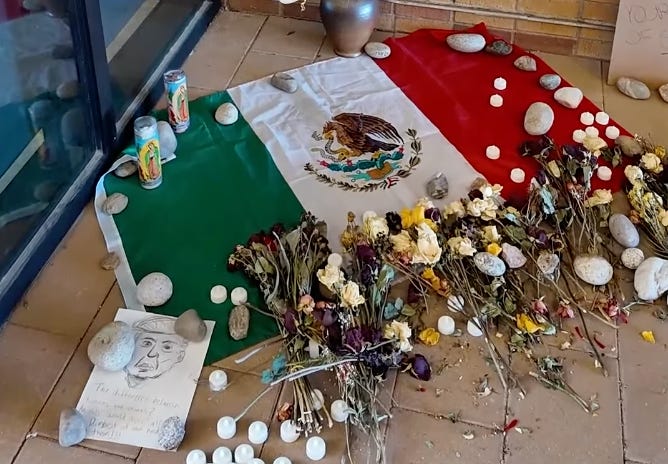 This past February, Quiñonez had a scheduled installation titled Ni de Aquí, Ni de Allá (Not From Here, Not From There) at the University of North Texas. The exhibit features giant resin paletas (Mexican popsicles) with seals that read “U.S. Department of Stolen Land Security” and “U.S. Inhumane and Cruelty Enforcement.”