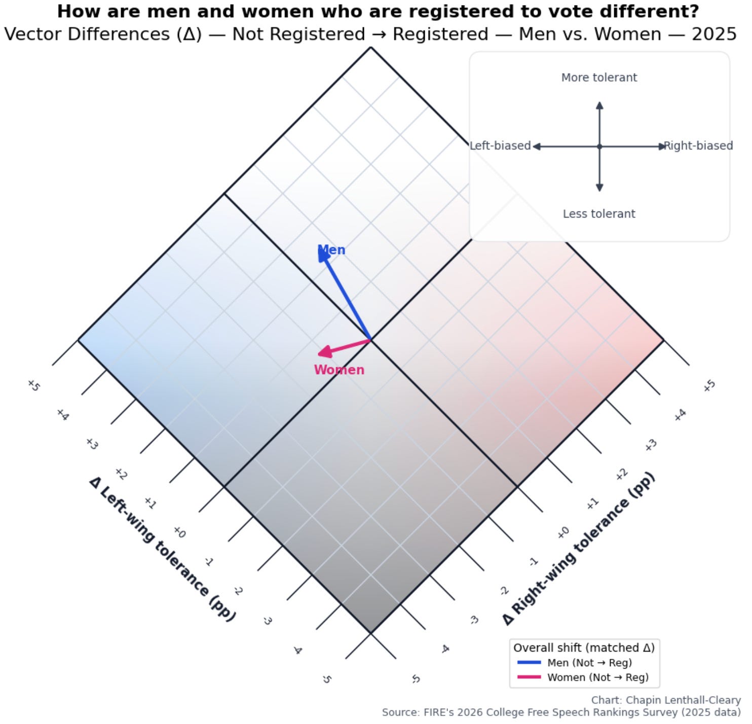 To show differences between men and women who are registered to vote and those who aren’t, we’ll use something called a vector difference plot. Think of it as drawing arrows that represent how people move on the free-speech map when we go from looking at those unregistered to vote to those that are registered. The arrows all start from the center so you can compare their directions and lengths directly. In short, these arrows capture the impact of being registered on men’s and women’s positions in the free-speech landscape. They aren’t showing how tolerant men and women are, just the difference in tolerance between registered and unregistered men and women: