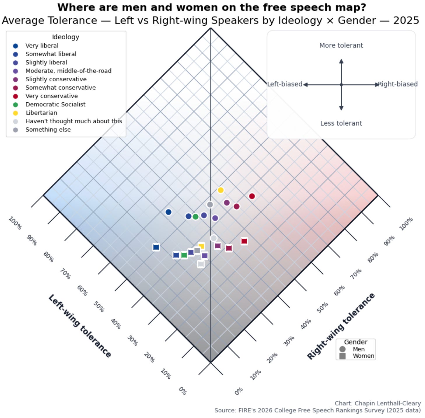 We’ve already seen that when we ask students whether they’d allow controversial speakers on campus, men are far more tolerant. In fact, men are often more tolerant of speakers from the opposite side of the political spectrum than women are of their own side. That’s pretty wild. So the natural question is, what else drives tolerance? Even better, is any of it something we could actually influence?