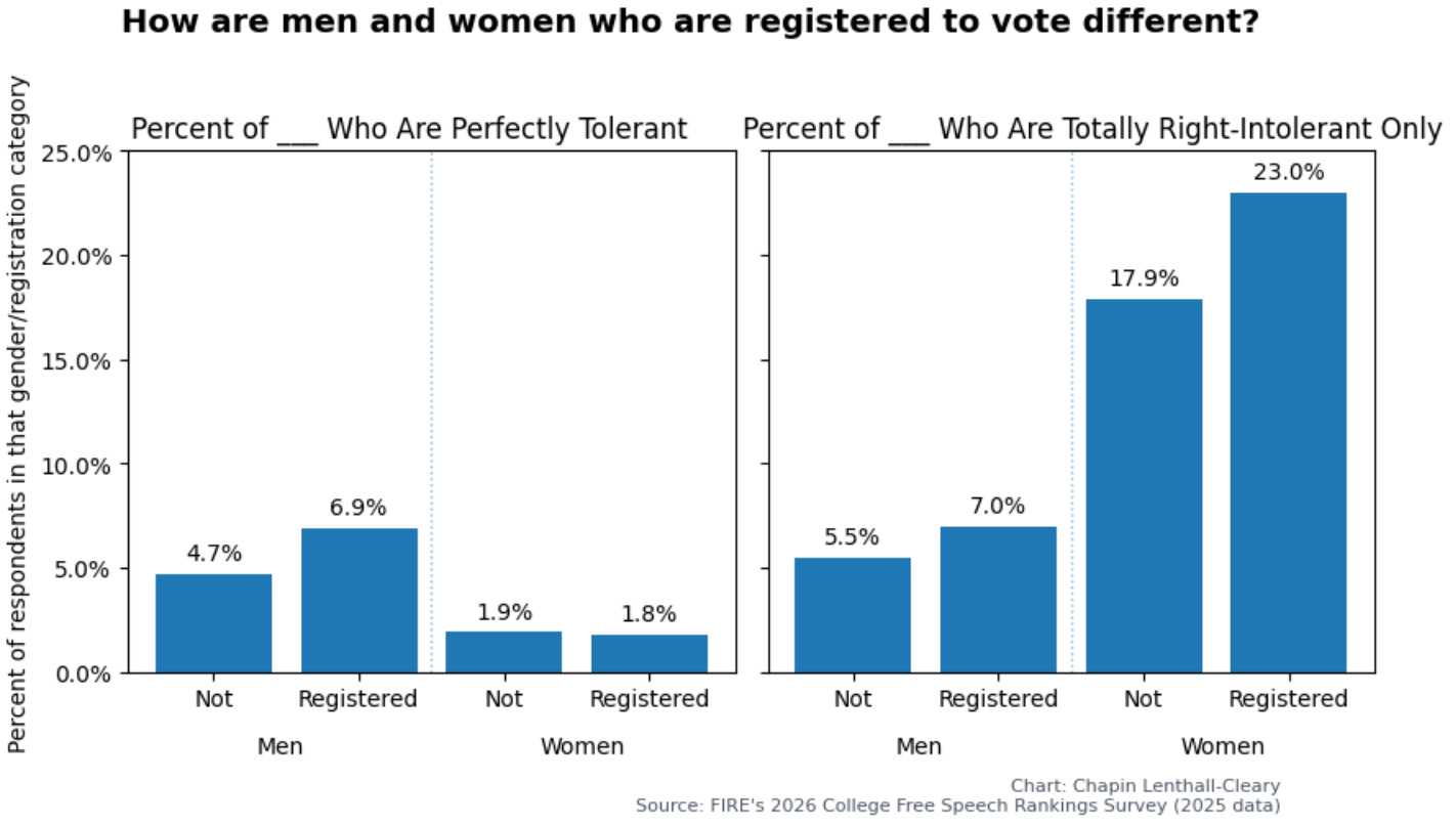 For men, the boost in tolerance mostly comes from one place: registered men are a lot more likely to be “perfectly tolerant” — the folks who say they’d allow every speaker that we ask about, full stop. Those men registered to vote seem more likely believe in the principle of free speech for all. That relationship is inverted for women. Instead, being a registered female voter is related to being totally intolerant of the right specifically. Men see a bump in that zone too, but it’s much smaller — and still overshadowed by the much larger increase in men who are fully tolerant across the board.