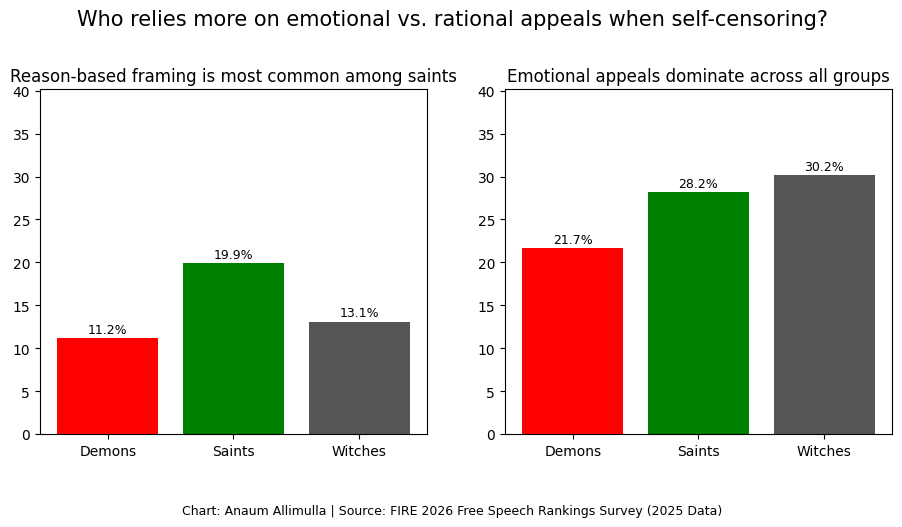 The selectively censorial Witches show the most emotional reasoning. If a particular viewpoint makes them feel bad, they don’t want that speaker platformed. By contrast, rational arguments are most common among Saints. As one student said, “I did not agree with the speaker, but everyone should be allowed to speak to create a diverse environment.” But Saints also lean more on emotional appeals than rational ones. In other words, even the most principled group operates less on principle than on how situations feel.