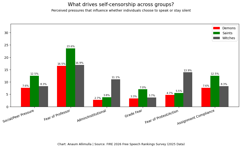 We then drilled down on more specific reasons for self-censorship. Fear of professors stands out as the top reason given by all groups, especially Saints. Saints also generally report higher sensitivity overall. This makes sense since they oppose censorship and are therefore more sensitive to factors that might cause it. Meanwhile, Witches are more worried about administrative pressure and protests compared to other groups. It’s also worth noting that grade fear is relatively low across the board, suggesting academic penalties usually matter less than social dynamics or pressure from authority figures.