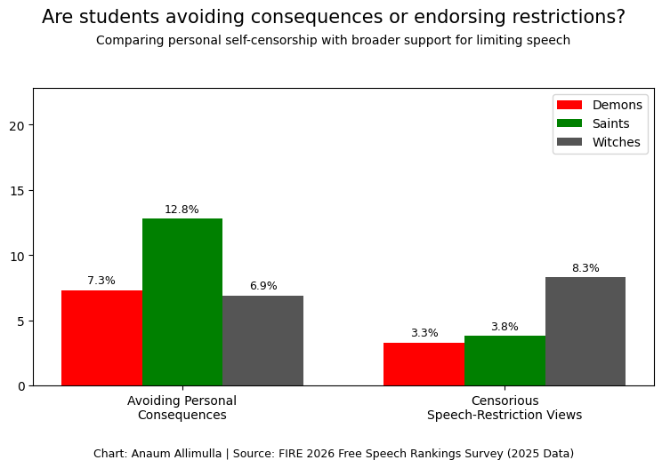 Across all three groups, a common reason students self-censor is to avoid personal consequences, such as judgment from peers, especially the Saints. Another sentiment expressed in the self-censorship responses is a belief that certain viewpoints should not be openly expressed. Interestingly, more Witches mentioned this than avoiding personal risk. As one student said, “When they were talking about transgenders . . . I do not think that should be allowed.”