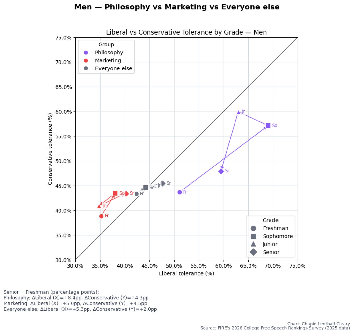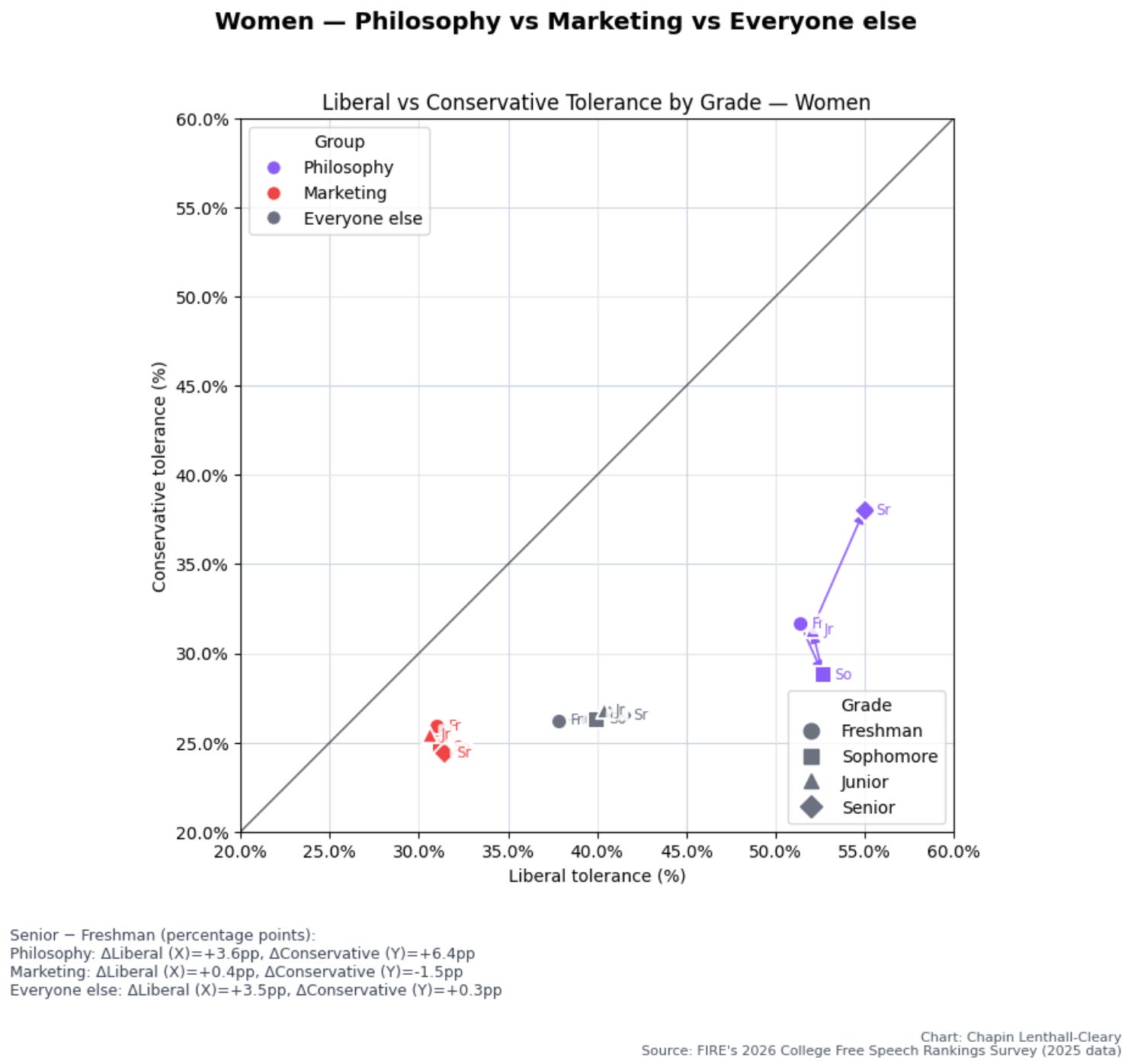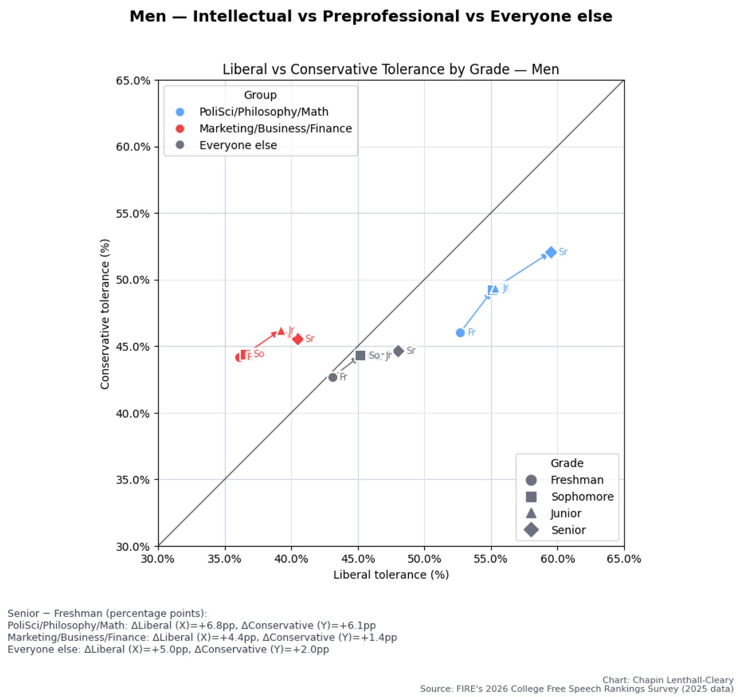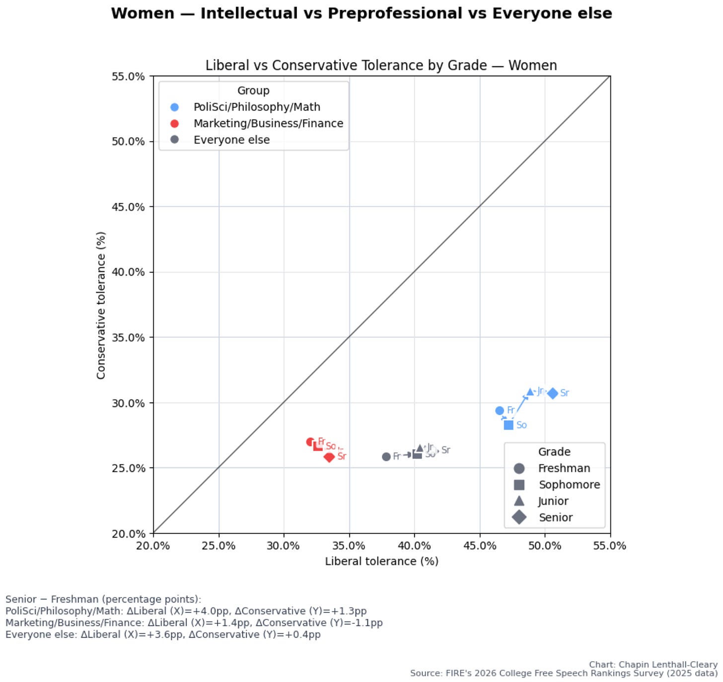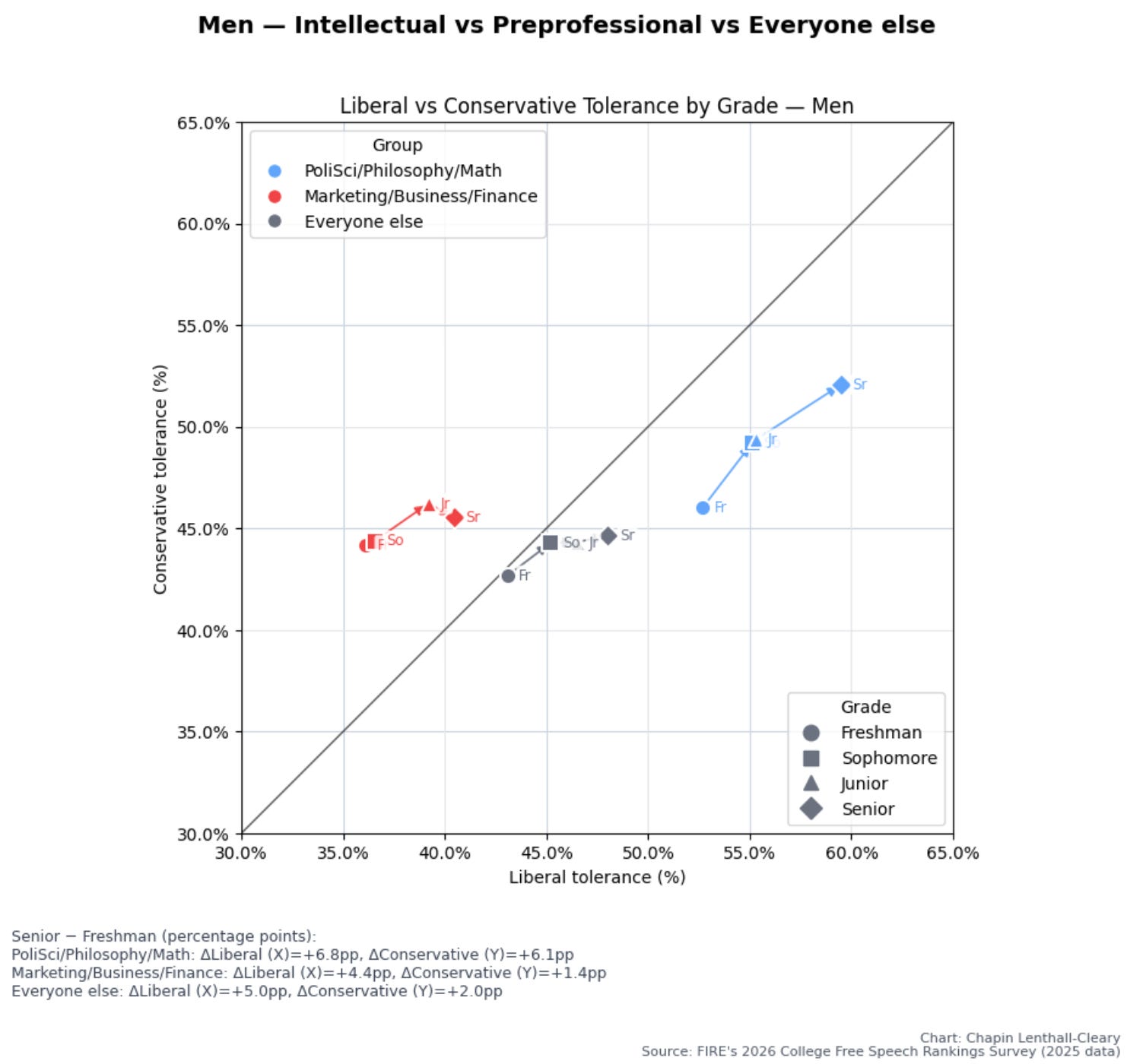Among men, all bins have seniors higher in both dimensions than freshmen, but the gap is smaller (compared to everyone else) for the marketing/finance/business bin, and noticeably larger for the poli sci/philosophy/math bin. Women show a similar effect, but with smaller gaps in general, and seniors in marketing/finance/business showing lower right-wing tolerance than freshmen in those subjects, suggesting a decrease during college.