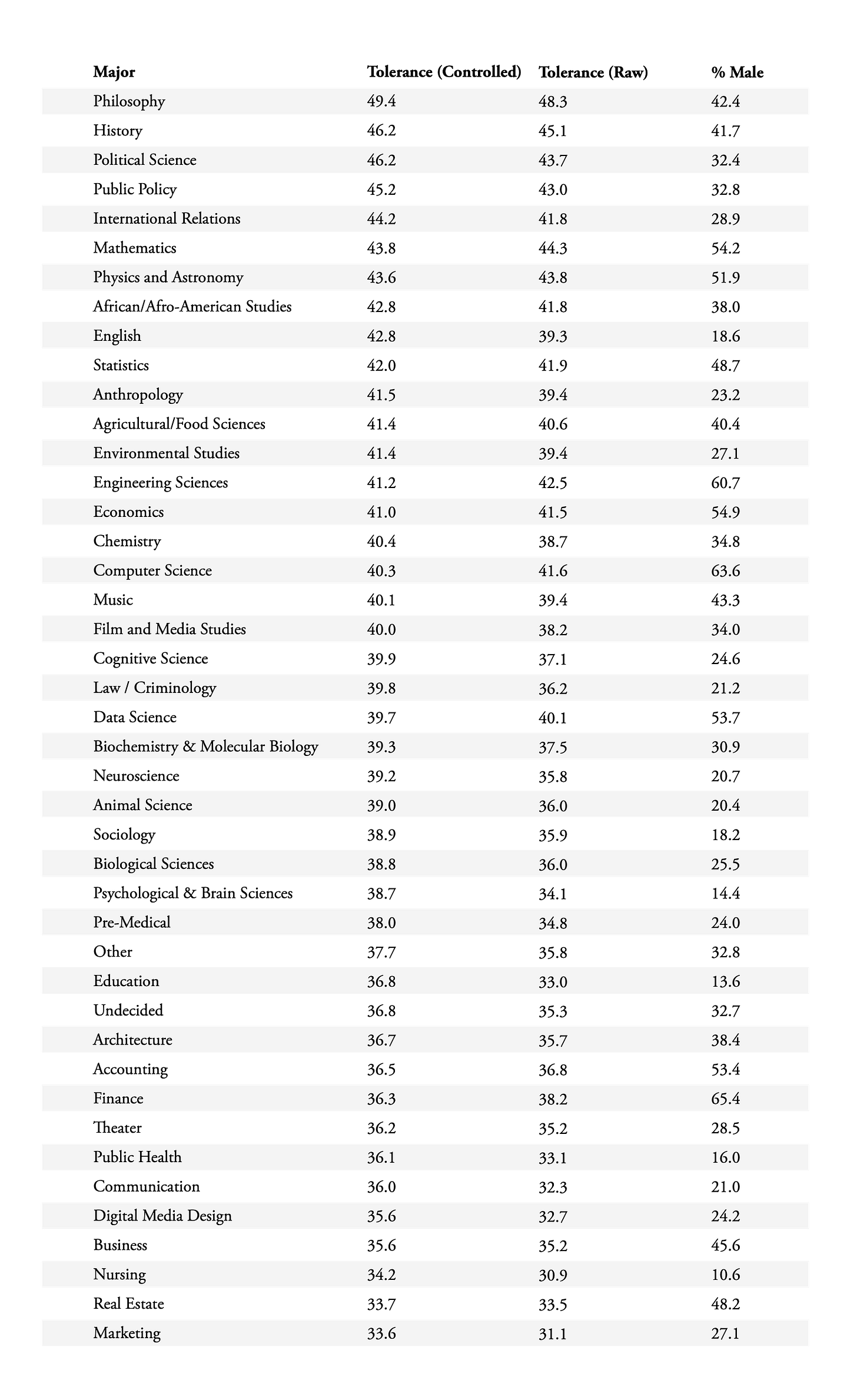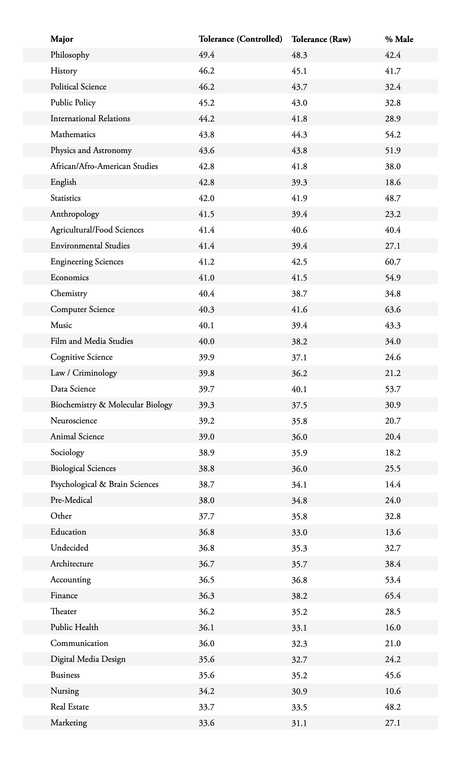 That question isn’t easy to definitively answer using our data, but one way to approach an answer is by looking at which majors have students who are unusually tolerant. Here’s a list of all majors with at least 100 men and 100 women in our sample, along with the average rate of political tolerance for each, both controlled for gender and not: