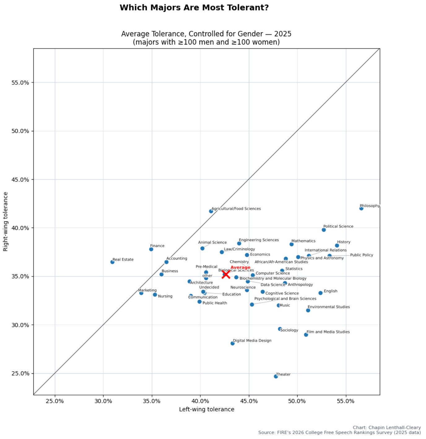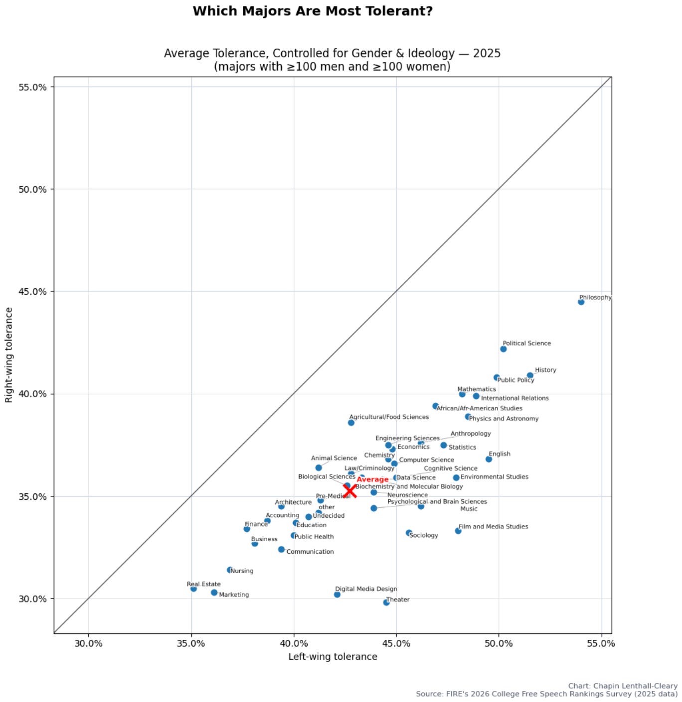 A lot of the more “tolerant” majors are disproportionately filled with people on the left. But once you control for that, they tend to be more tolerant of both sides. The preprofessional majors tend to sit at the bottom of both axes. Conversely, even some of the “woke studies” majors actually do fairly well. African American studies has above-average left- and right-wing tolerance.