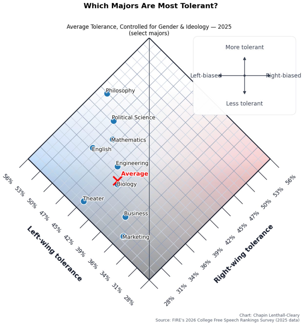 Majors often mocked as “woke studies” perform better than critics might guess. Gender studies students tend to show higher tolerance than those in finance, real estate, or marketing, while students in African American studies tend to be more tolerant of both left- and right-wing speakers.