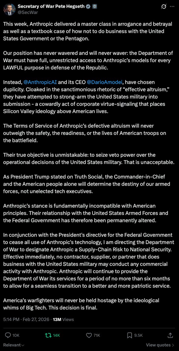 Yesterday, the Department of War officially informed Anthropic’s leadership that the company and its products are deemed a supply chain risk, effective immediately.