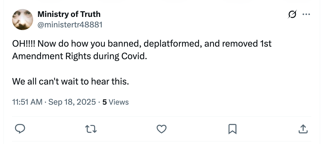 Not only did we not ban or deplatform any rights during Covid, we vehemently oppose speech bans and deplatforming. In fact, we keep a Campus Deplatforming Database to help monitor and curb such practices. And we have spoken out against government efforts to police disinformation as well as misinformation.