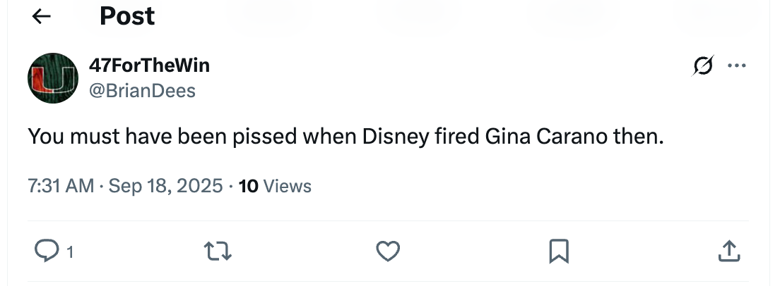 Yes, but we were a campus-only organization at the time, and by the time we expanded in 2022, she had already sued. (Some of us were pissed personally that they ruined The Mandalorian to do it, if that helps.) Also, there’s a difference between a company caving to a cancel-culture campaign like the one that targeted Carano, and a company making a similar decision under threats from the government. Yes, both are bad for free-speech culture. But one is prohibited by the Constitution.